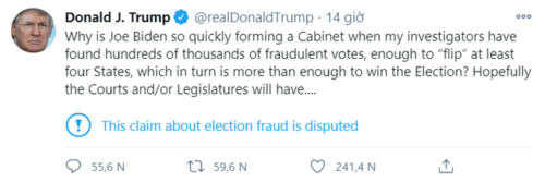 “Tại sao ông Joe Biden lại nhanh chóng lập nội các như vậy khi mà các điều tra viên của tôi phát hiện hàng trăm nghìn phiếu bầu gian lận, đủ để lật kết quả ở ít nhất 4 bang, hay thừa sức để thắng cử”, Politico dẫn bình luận trên Twitter ngày 21/11 của Tổng thống Trump.